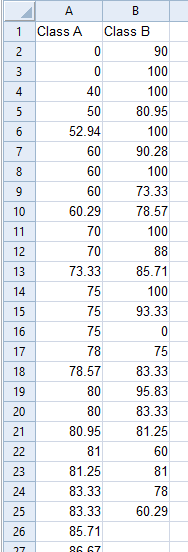 This histogram example uses relative frequencies to compare two different-sized distributions. This setup is useful when the sample size of the data sets varies, but you still want to compare the distribution overall. A common use case for this histogram example is classes with different numbers of students. With this comparison, we can answer questions like ‘What percentage of students scored in the Mastery range?’ or ‘What fraction of students are failing?’ The visualization showing the classes adjacent makes it clear, so we can compare how the students are performing against each other.